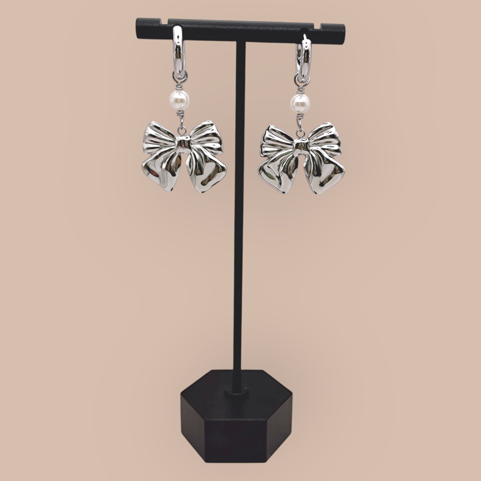 De Silver Pearl Bow Hoops combineren speelsheid en elegantie in één design. De glanzende zilveren strikjes worden subtiel afgewerkt met een kleine parel, wat zorgt voor een vrouwelijke en luxueuze uitstraling. Perfect om je outfit een charmante touch te geven – van dagelijks gebruik tot een feestelijke gelegenheid.