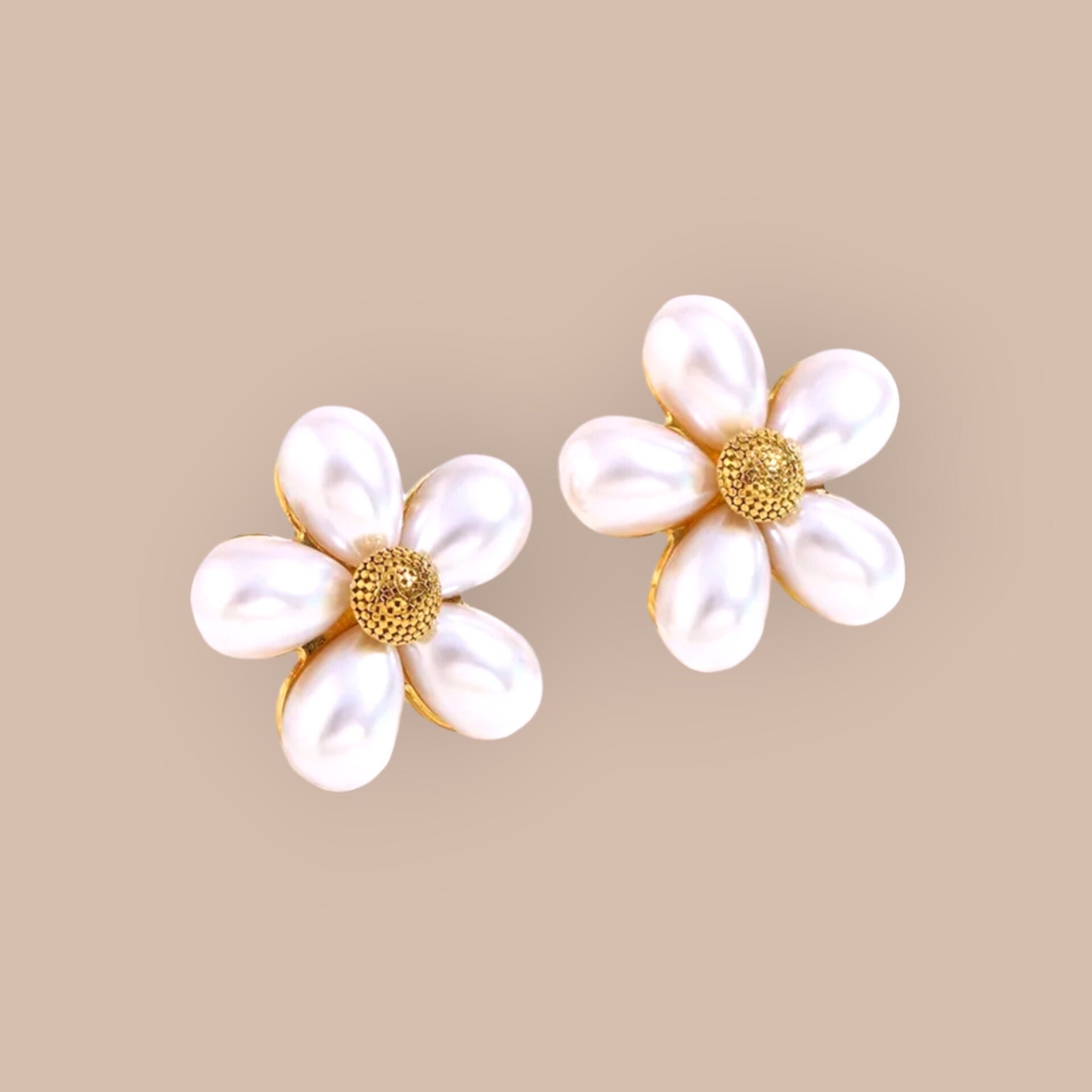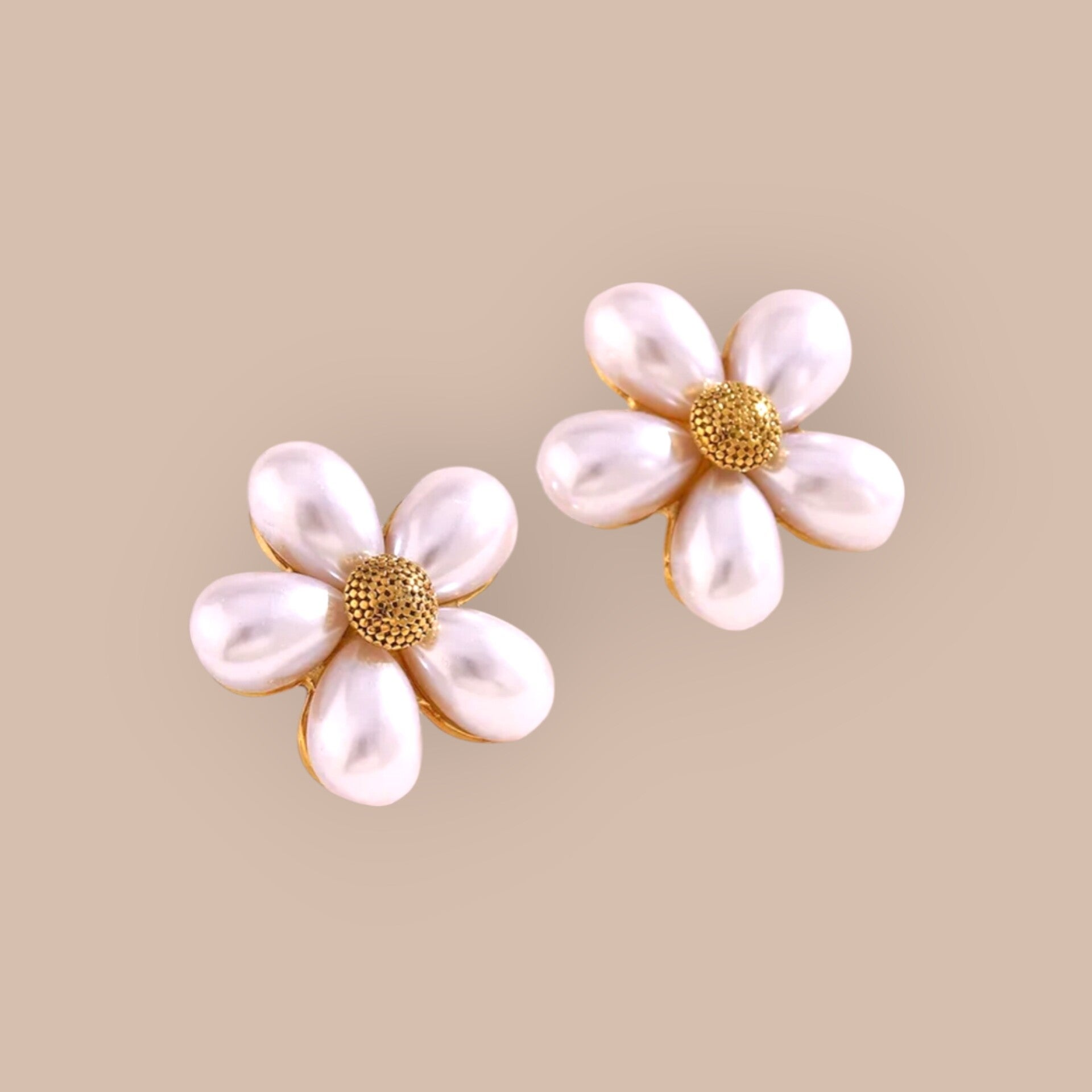 Prachtige bloemoorbellen met vijf delicate parelmoer-achtige blaadjes die zijn gerangschikt als een madeliefje. Het hart van elke bloem bestaat uit een getextureerd goudkleurig centrum met een subtiele glinstering. Deze elegante statement oorbellen combineren natuurlijke charme met een verfijnde uitstraling, perfect voor zowel dagelijks gebruik als speciale gelegenheden. De zachte iriserende glans van de blaadjes geeft deze oorbellen een tijdloze en vrouwelijke look.
